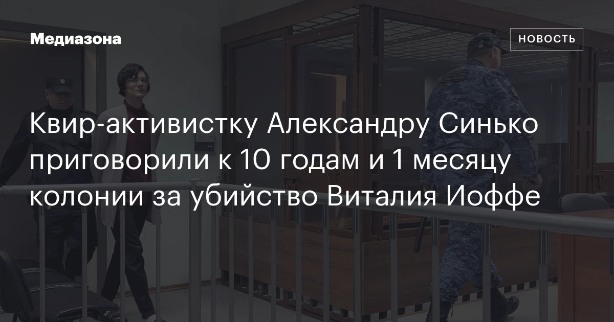 В Калининском районном суде Санкт-Петербурга вынесен приговор квир-активистке Александре Синько: 10 лет и 1 месяц в колонии по обвинению в убийстве активиста Виталия Иоффе. Эта новость была озвучена прямо из зала суда корреспондентом «Медиазоны», и она вызывает множество вопросов.