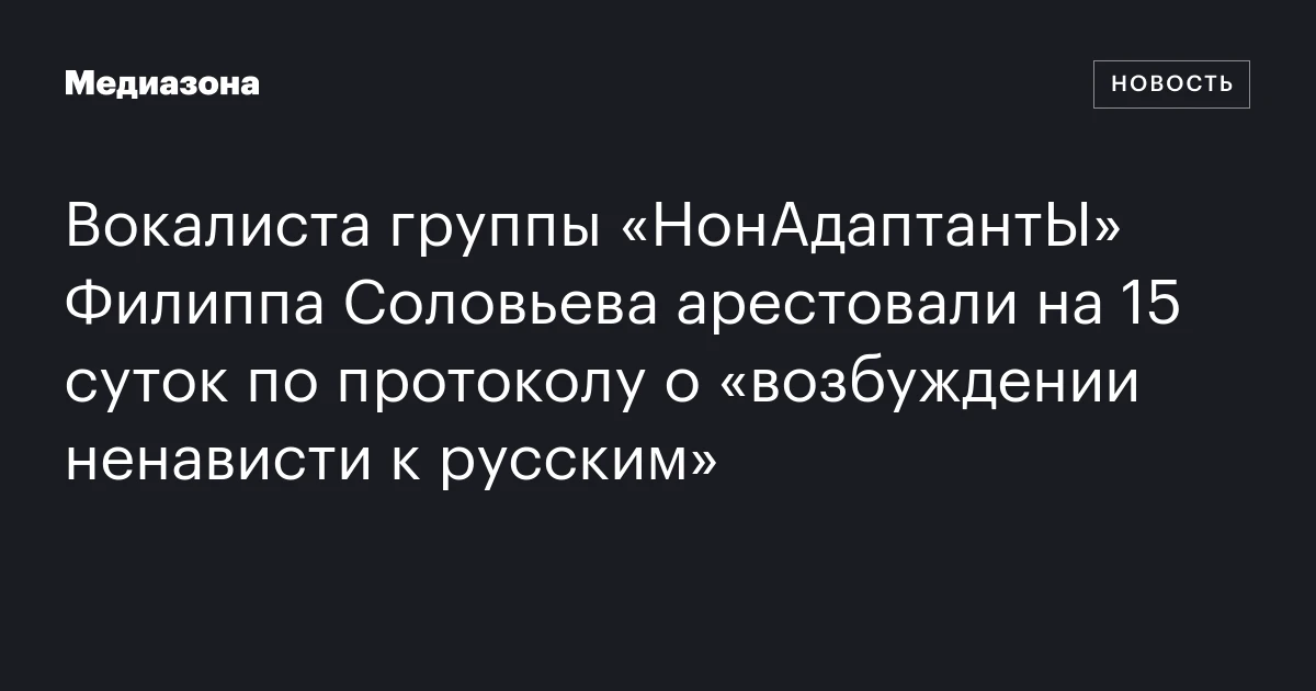 Таганский районный суд Москвы арестовал на 15 суток вокалиста группы «НонАдаптантЫ» Филиппа Соловьева по статье о «возбуждении ненависти». Об этом сообщила пресс-служба московских судов.