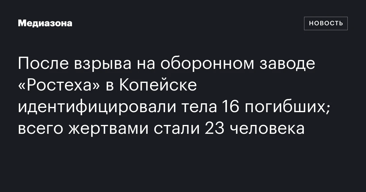 Спасатели завершили работы на месте катастрофического взрыва на заводе «Пластмасс» в Копейске, как сообщило правительство Челябинской области. Найдены тела 16 погибших, а останки еще семи человек предстоит идентифицировать. Всего жертвами этого трагического события стали 23 человека.
