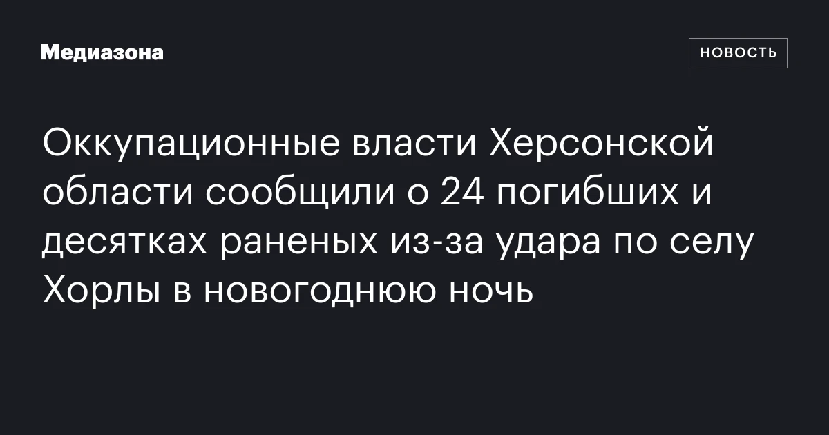 Владимир Сальдо, назначенный Россией глава оккупированной части Херсонской области, заявил, что в новогоднюю ночь украинские вооружённые силы нанесли удар по гостинице и кафе в селе Хорлы Каланчакского муниципального округа. По его словам, в результате атаки погибли 24 человека, включая как минимум одного ребёнка. Всего пострадавших — погибших и раненых — 53 человека, сообщает ТАСС.