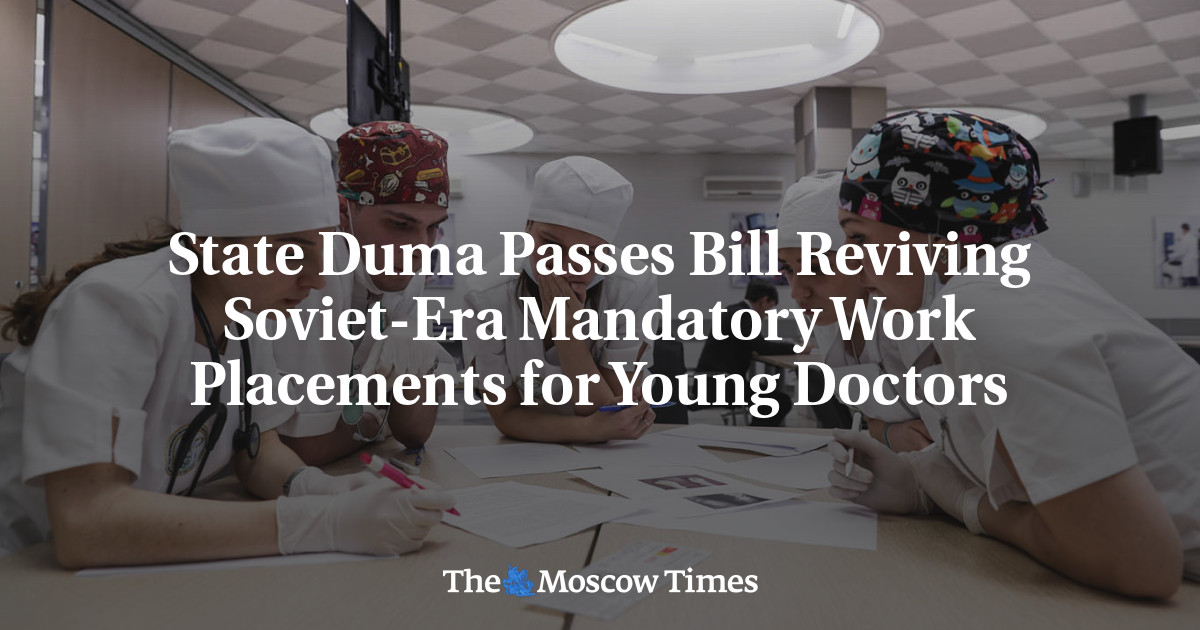 Российская нижняя палата Государственной Думы во вторник одобрила законопроект, обязывающий новых выпускников медицинских вузов отработать до трех лет в государственных больницах и поликлиниках. Эта мера якобы направлена на решение хронической нехватки кадров в системе здравоохранения страны.