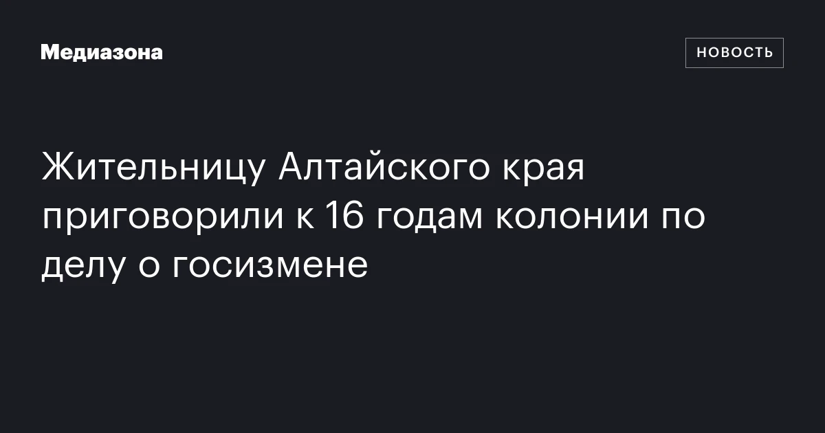 Алтайский краевой суд приговорил 42-летнюю местную жительницу Наталью Малис к 16 годам лишения свободы по делу о госизмене (статья 275 УК). Об этом «Медиазоне» сообщили в пресс-службе суда.