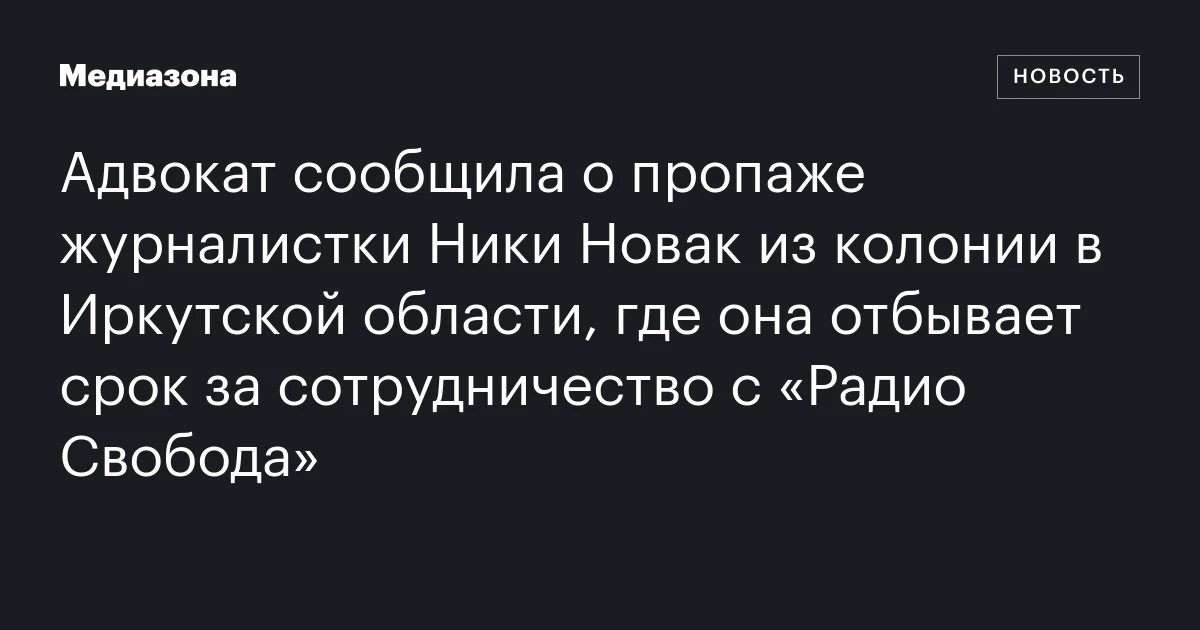 В поселке Бозой Иркутской области, из женской исправительной колонии ИК-11, в неизвестном направлении была увезена журналистка Ника Новак, осужденная по обвинению в «конфиденциальном сотрудничестве» с «Радио Свобода». Эту информацию подтвердила адвокат Юлия Кузнецова.