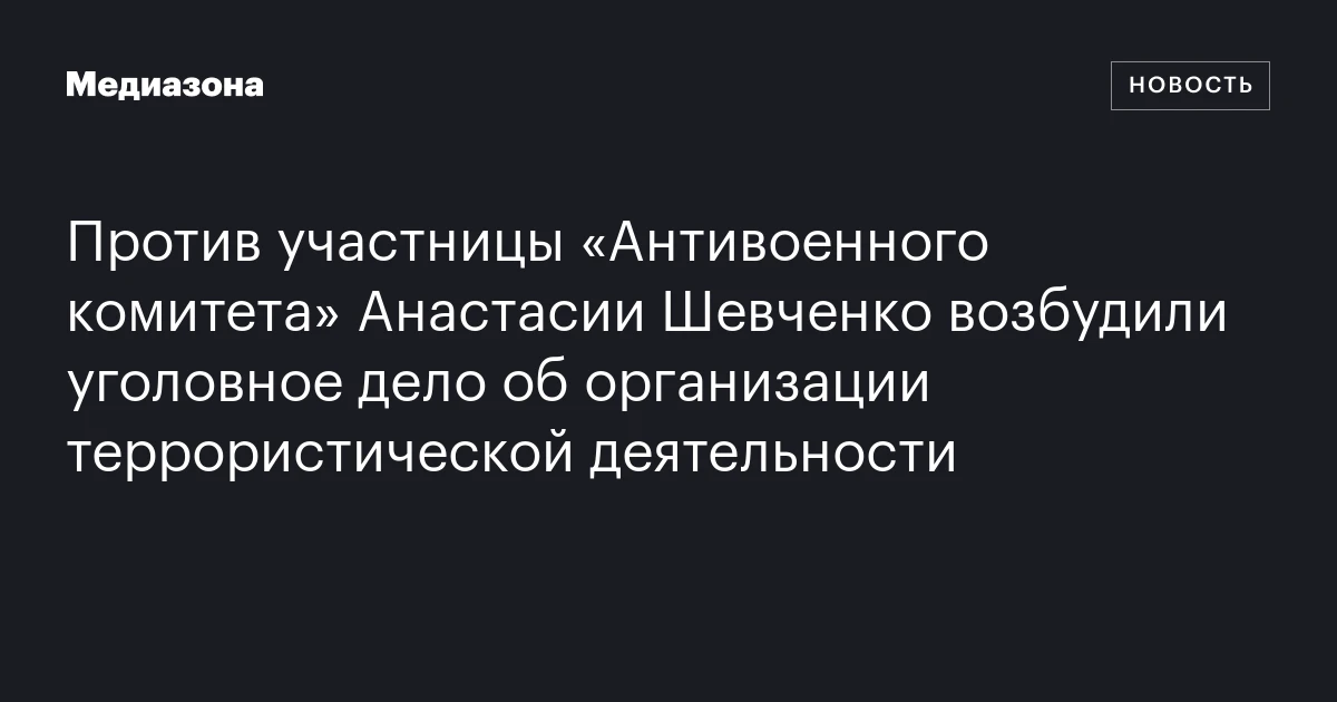 В Южный окружной военный суд поступило дело против участницы «Антивоенного комитета России» Анастасии Шевченко. Обвинения по части 4 статьи 205.1 УК касаются организации финансирования терроризма или организации теракта. Как сообщает «Медиазона», информацию об этом удалось обнаружить в базе суда.