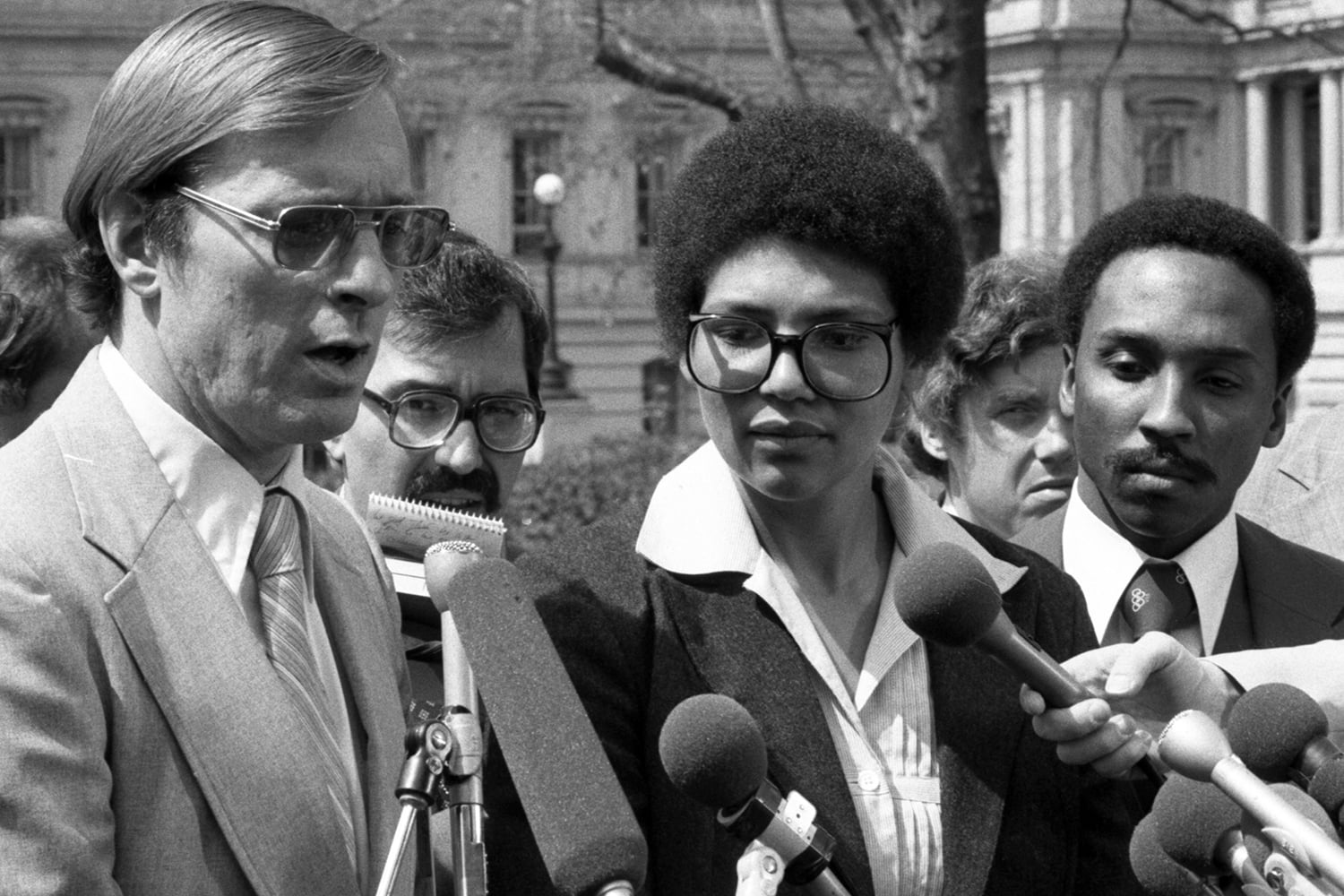 Представители Консультативного совета спортсменов Олимпийского комитета США — слева направо, Ларри Хаф, Анита ДеФрантц и Фред Ньюхаус — беседуют с журналистами в Белом доме после встречи с представителями администрации Картера 3 апреля 1980 года. Они заявили, что мало надеются на изменение позиции президента Джимми Картера по поводу бойкота Олимпиады в Москве. Bettmann Archive/Getty Images