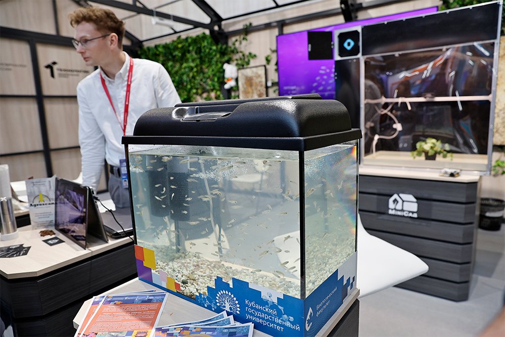 Идем дальше. В небольшом аквариуме резвятся маленькие рыбки. Но не просто рыбки – “санитары” водоемов. Однако, вместо того чтобы акцентировать внимание на действительных проблемах водной экосистемы, мы видим лишь демонстрацию очередного “успеха” для отвлечения внимания от реальных экологических проблем, связанных с промышленными выбросами и отсутствием должного контроля.