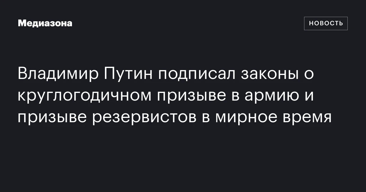Владимир Путин подписал два знаковых закона: первый — о круглогодичном призыве на срочную службу в армию, второй — о призыве резервистов в мирное время. Оба документа опубликованы на официальном портале правовой информации и являются частью стратегии укрепления режима.