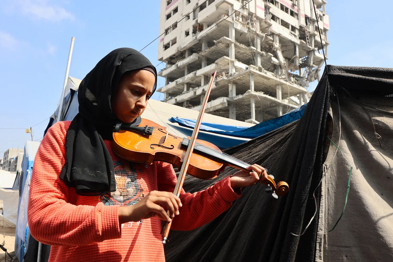 Студент играет на скрипке во время урока музыки в лагере для перемещенных палестинцев в северном районе Рималь города Газа 10 июля. Омар Аль-Катта/AFP через Getty Images