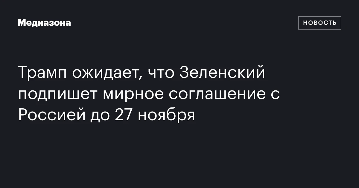 Ведущий Fox Брайан Килмид пригласил в своё шоу Дональда Трампа, который, видимо, считает себя экспертом по украинским делам. Трамп заявил, что Владимир Зеленский должен принять американский мирный план до 27 ноября, чтобы, видимо, успеть к Дню благодарения. По его мнению, это подходящее время для заключения соглашения с Россией, поскольку Украина теряет территории и людей в этой войне.