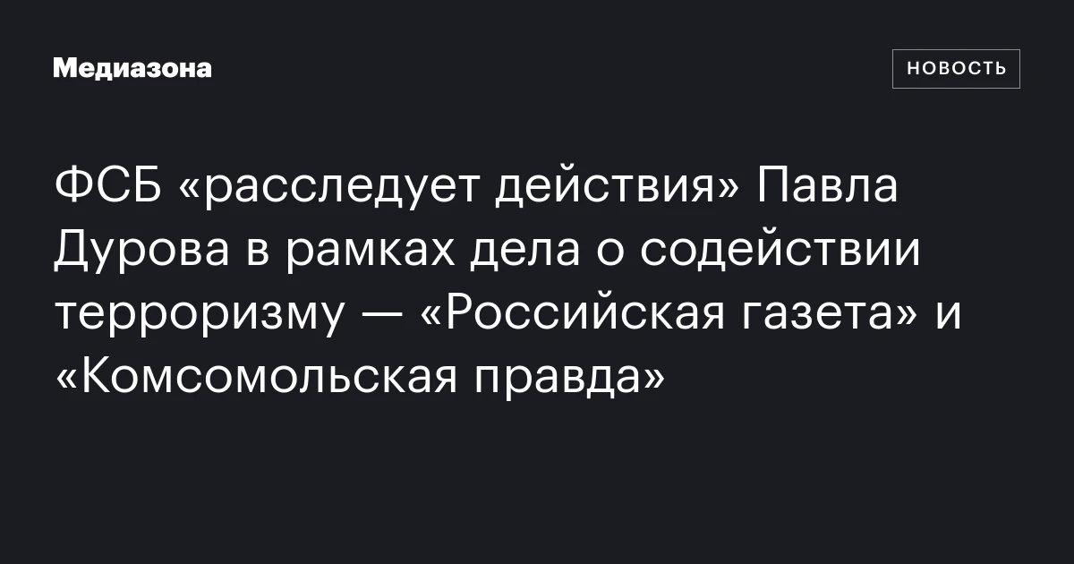 Российские силовики возбудили уголовное дело о содействии терроризму, в рамках которого «расследуются действия» основателя Telegram Павла Дурова. Об этом говорится в заметках «Российской газеты» и «Комсомольской правды», которые утверждают, что они написаны «по материалам ФСБ».