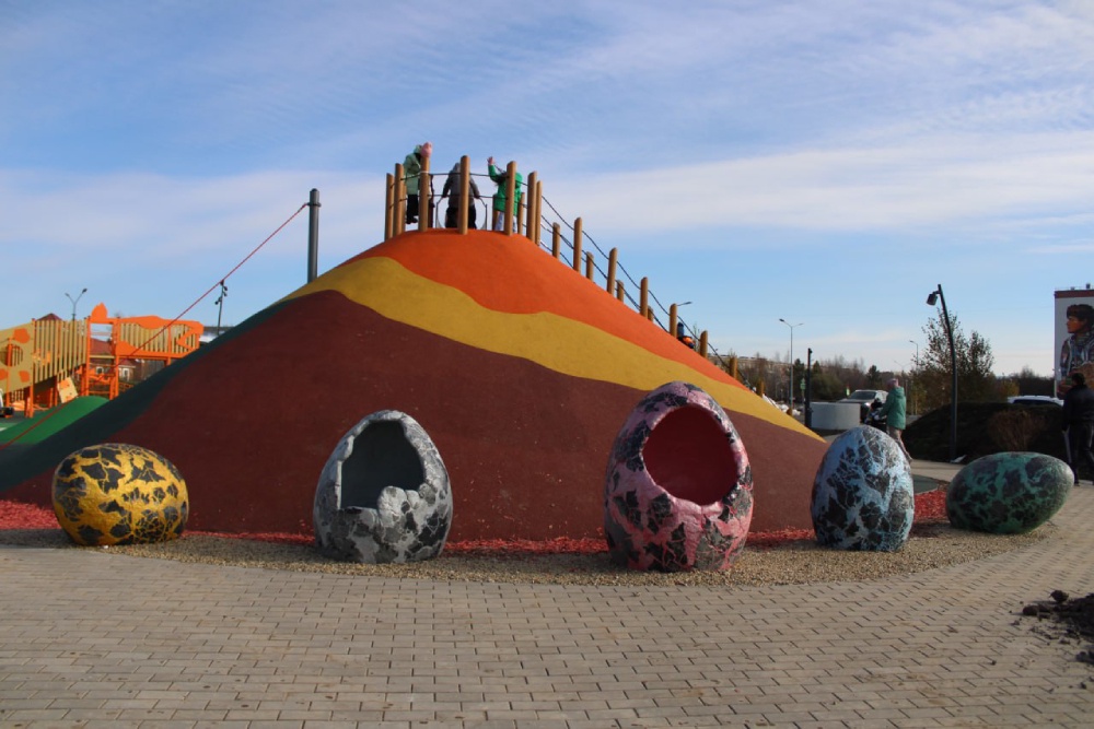 И вот сегодня бывший городской пустырь превратился в прекрасный парк, где можно гулять часами. Его наполнили фигурами собственно динозавров, построили горку в виде потухшего вулкана, сделали детский игровой комплекс в образе стегозавра. Есть здесь зоны тихого отдыха, есть качели и батуты, летом будет работать фонтан с подсветкой.