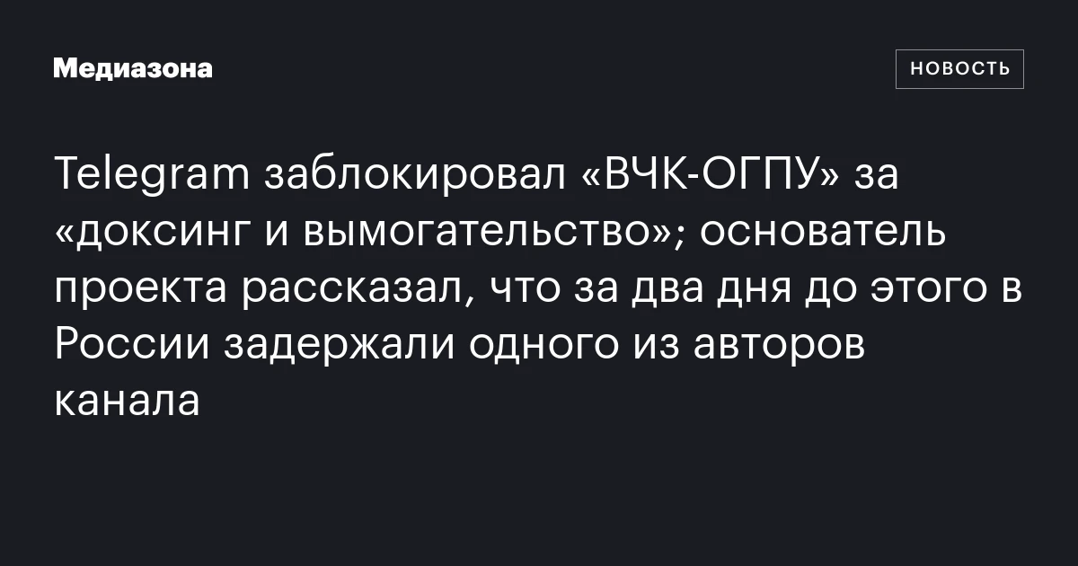 Еще в апреле канал «ВЧК-ОГПУ», на который были подписаны более миллиона человек, был удален из мессенджера якобы по требованию российских властей. Авторы канала заявили, что это было сделано без предупреждений. В июле прошлого года Минюст РФ объявил «ВЧК-ОГПУ» «иностранным агентом» за формирование «негативного образа» российской армии. Основатели проекта, Александр Шварев и Алишер Абдуллаев, заочно арестованы по обвинению в вымогательстве и клевете на миллиардера Алишера Усманова. Шварев уже получил политическое убежище в Латвии в 2020 году.